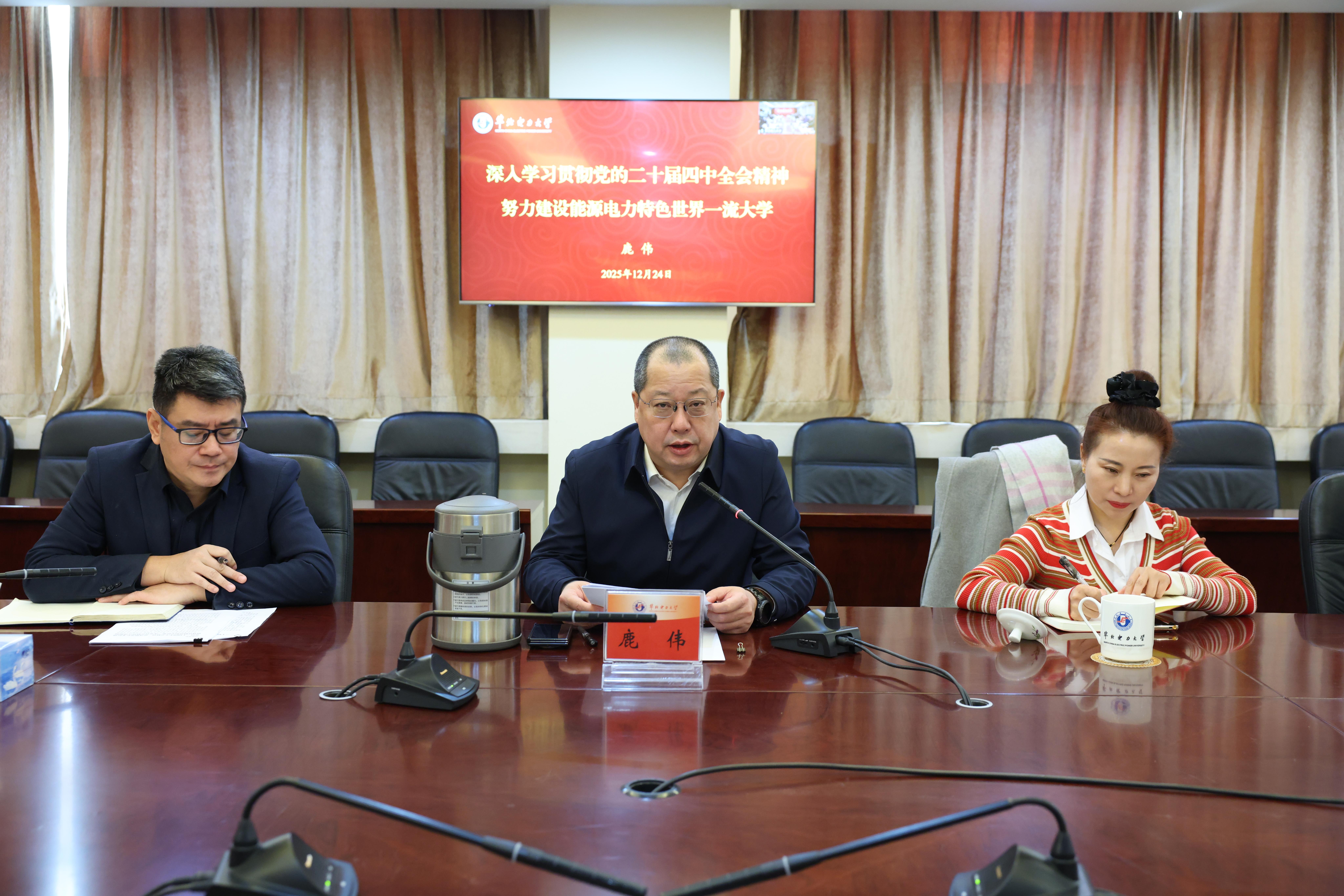 12月24日上午,校级宣讲团成员、校党委常委、副校长鹿伟以《深入学习贯彻党的二十届四中全会精神,努力建设能源电力特色世界一流大学》为题,面向联系院系和分管部门的干部师生代表专题宣讲学校第三次党代会精神。宣讲以视频方式在两地同步举行。